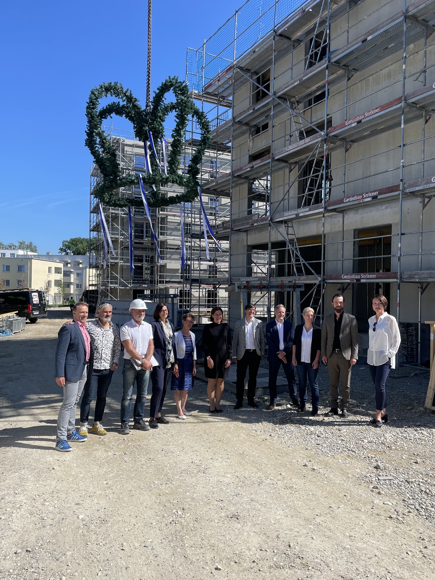Auf der Baustelle der Wohnanlage in München Lochhausen konnte heute Richtfest gefeiert werden. Die Häuser werden als Systemhäuser in vorgefertigter Hybridbauweise errichtet.