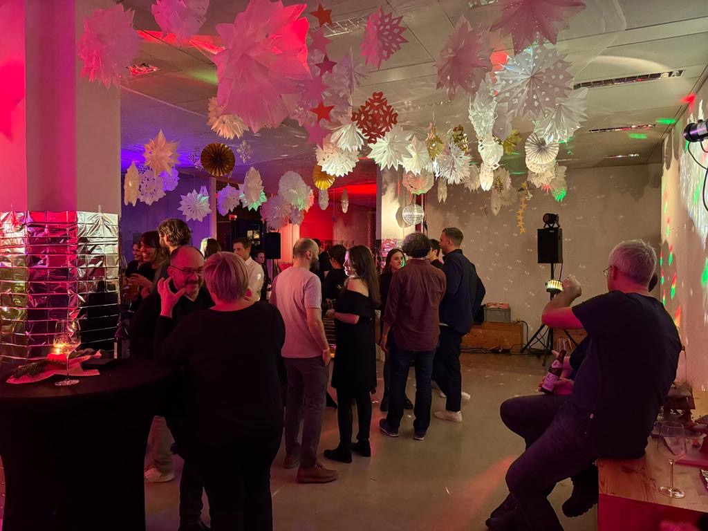 Unsere Weihnachtsfeier fand in diesem Jahr in unseren Büroräumen am Bavaria statt. Alle zusammen hatten jede Menge Papiersterne für die weihnachtliche Deko gebastelt, die bei dem Fest an der Decke erstrahlten und eine ganz besondere Atmosphäre zauberten. Nach einem Tag mit Pfefferkuchen-Wettbewerb samt Preisgericht und einem Ausstellungsbesuch im Museum Brandhorst haben am Abend unsere DJs Frank, Sebastian, Grischa und Clemens aufgelegt. Von einem Caterer wurden wir mit leckeren Häppchen versorgt und hatten sehr viel Spaß zusammen.