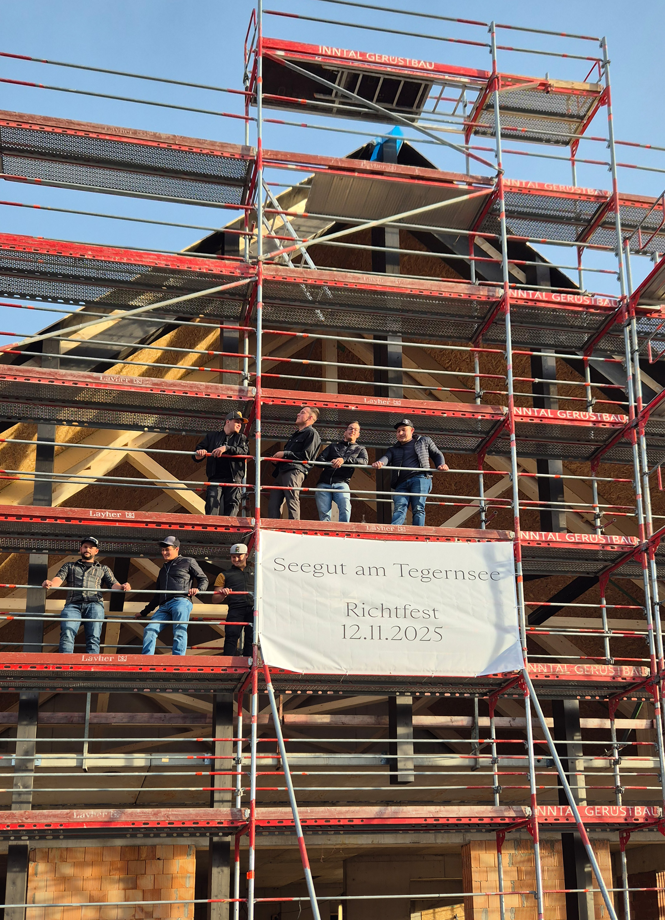 Beim Seegut am Tegernsee wurde Richtfest gefeiert für den Neubau einer Hotelanlage, einer Gastronomie, eines Spa-Bereichs und dreier Mietwohngebäude mit Tiefgarage und Nebenräumen.