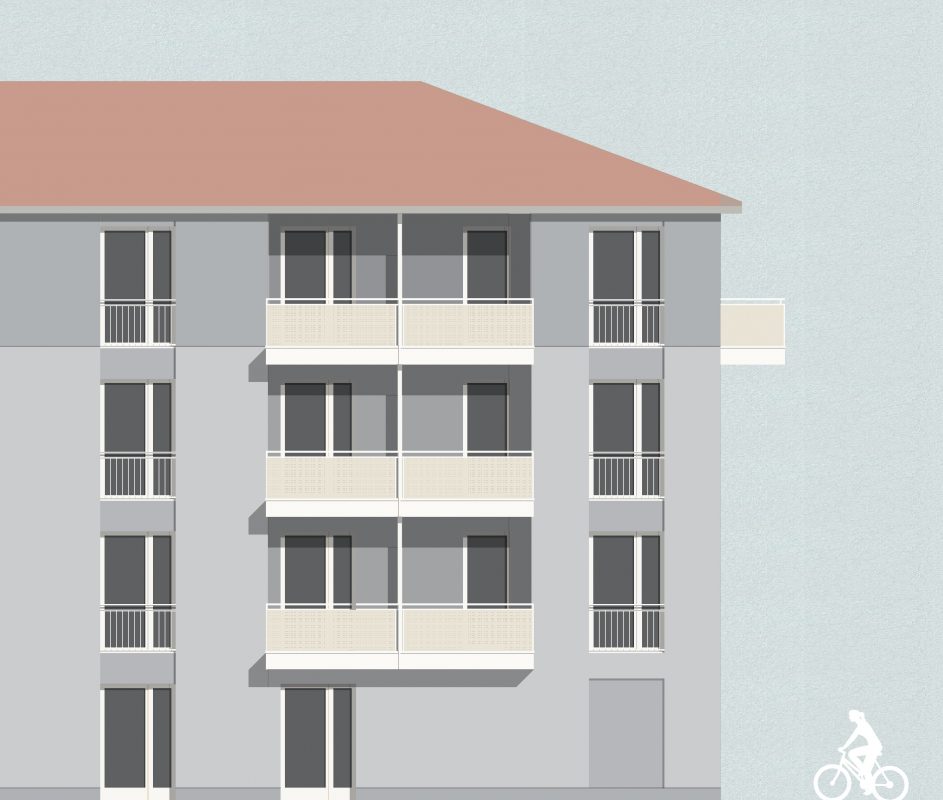 Das Gebäudeensemble besteht aus einem viergeschossigen Satteldachbau in L-Form sowie einem zweigeschossigen Baukörper mit Flachdach. Die Kubatur hält sich an die Vorgaben des Bebauungsplans. Jede Wohnung verfügt über einen eigenen Freisitz, im Erdgeschoss sogar mit Gartenfläche. Das Wohnungsangebot ist vielfältig und umfasst 2- bis 4,5- Zimmer- Wohnungen. Ein Drittel der Wohnungen ist gefördert, der Rest ist freifinanziert. Einige Einheiten sind als Maisonettewohnungen gestaltet.
