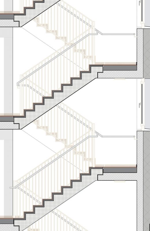 Das Mehrfamilienhaus wird durch drei Haupttreppenhäuser erschlossen, die vom Untergeschoss bis zum dritten Obergeschoss führen. Die fünf Maisonettewohnungen im südlichen Gebäudeteil sind direkt erdgeschossig über einen Außenzugang erreichbar. Im Untergeschoss befindet sich die eingeschossige Tiefgarage, die über eine separate Zufahrt im Süden angefahren wird. Hier sind auch Kellerabteile und Technikräume untergebracht. Die Müllräume und der große Fahrradraum sind im Erdgeschoss positioniert.